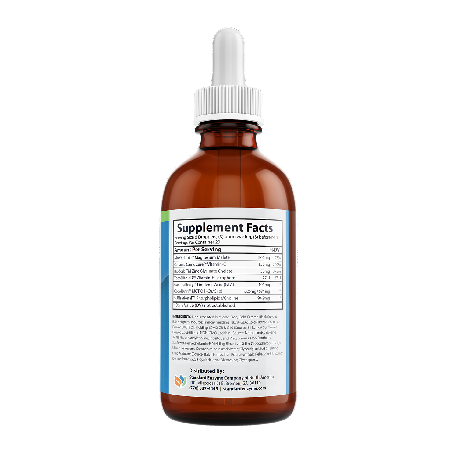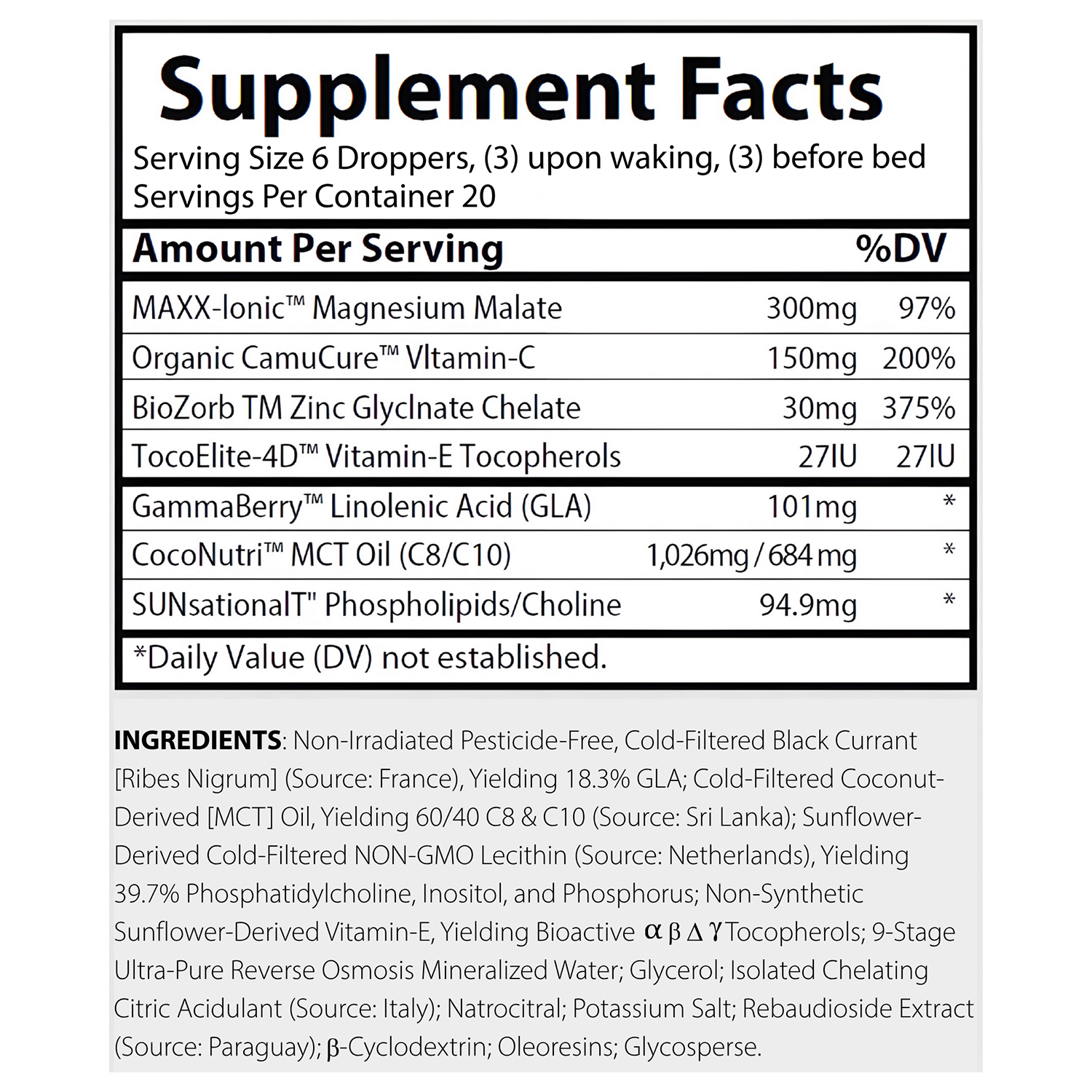 Non-Irradiated Pesticide-Free, Cold-Filtered Black Currant [Ribes Nigrum] (Source: France), Yielding 18.3% GLA; Cold-Filtered Coconut-Derived [MCT] Oil, Yielding 60/40 C8 & C10 (Source: Sri Lanka); Sunflower-Derived Cold-Filtered NON-GMO Lecithin (Source: Netherlands), Yielding 39.7% Phosphatidylcholine, Inositol, and Phosphorus; Non-Synthetic Sunflower-Derived Vitamin-E, Yielding Bioactive a B A Y Tocopherols; 9-Stage Ultra-Pure Reverse Osmosis Mineralized Water; Glycerol; Isolated Chelating Citric Acidulant (Source: Italy); Natrocitral; Potassium Salt; Rebaudioside Extract (Source: Paraguay); B-Cyclodextrin; Oleoresins; Glycosperse.